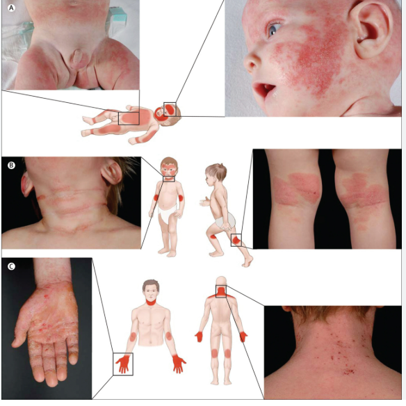 - 영·유아는 뺨, 팔, 다리에 집중되고, 성인은 접히는 부위에 주로 나타남